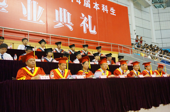 6月16日上午,我校2014届本科生毕业典礼暨学位授予仪式在体育馆隆重举行。校党委书记韩翼祥,校长王俊豪,校党委副书记王宇航、朱永康,副校长卢新波、黄建新,东方学院院长黄董良,校党委委员钟平出席了毕业典礼。此外,学校各职能部门和各学院负责人、教师代表和毕业生家长代表以及3444名2014届本科毕业生也参加了毕业典礼。典礼由校党委副书记王宇航主持。