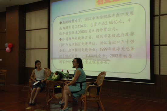 裘菊兰校友在与学生的交流中,用自己从一名中学英语教师到创办浙江永通的经历告诉学子们许多心得体会和人生感悟:“有梦,就应该放手去追”,“一定要做自己喜欢的事”,“兴趣是选择事业的第一要务”,“选择比努力更重要”,“一个人一生做一件事。学会坚持,不要放弃”。在她的带领下2001年浙江永通纺织品进出口有限公司,成为第一家进入世界顶级的巴黎“INTERSTOFF TEX-WORLD”时装面料展参展的浙江企业(年销售额达到1.6亿美元), 引起极大轰动,被法国最具影响力的《经济时报》广泛报道,让世界认识了浙江纺织企业。裘菊兰创业成功不忘回报社会,而说起慈善事业,她笑着说:“不是为求回报而做,只是想到那些人需要帮助。”她如亲人般地关心员工,关心他人,热心慈善事业,已累计为贫困学子和公益事业捐款达1000多万。