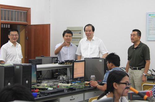 在政府管制研究院,王校长一行听取了研究院负责人关于我校首届博士研究生入学前的准备工作汇报。来到法学院时,恰逢法学院开展职称评审工作,王校长叮嘱学院负责人,职称评审工作要公平、公正,切实维护好教师的切身利益。在信息学院教师工作室,王校长与教师们亲切交谈,当了解到几位年轻博士已获得国家自然基金项目、教育部人文社科项目,并且已有学术论文发表在SCI一区时,王校长连声称赞,鼓励他们继续努力拼搏,为学校作出更大的贡献。王校长还看望了正在备战全国大学生电子设计竞赛的同学和指导老师,勉励他们为校争光。