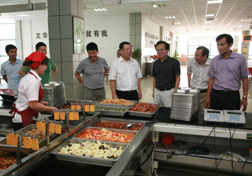 韩书记一行还来到学生食堂,亲切慰问了食堂工作人员,并向前来报到的新生及家长询问了解对学生食堂饭菜的满意情况。韩书记在充分肯定了食堂各项工作后,对进一步办好学生食堂提出要求。他希望后勤服务中心要牢固树立“安全第一”的生产理念,严把食品进货关、储存关、加工制作关、消毒关等环节,确保食品卫生,同时要采取开源节流、严控成本、内部挖潜、丰富菜品等多项措施,最大限度的保障饭菜质量和价格稳定。他指出,后勤服务务必要将群众路线教育实践活动贯穿到各项工作中,努力做到让学校满意、师生满意和职工满意。