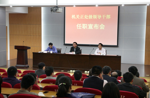 4月15日下午,我校在行政楼二楼报告厅召开专门会议,宣布机关正处级领导干部任职决定,机关部门工作人员参加会议。校党委书记韩翼祥出席会议并讲话,党委副书记朱永康主持会议。