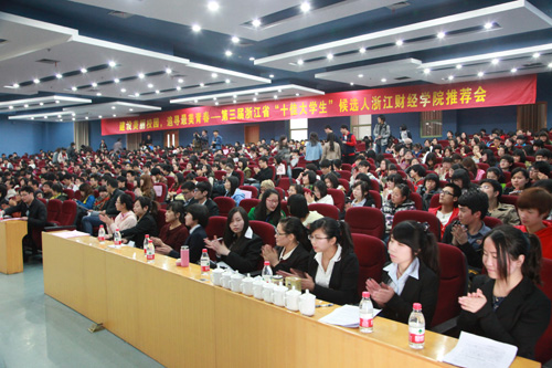 为挖掘、培育德智体美全面发展,在思想道德、学业科研、社会实践、志愿服务、社会工作等方面表现突出,模范践行社会主义核心价值观的优秀大学生,引领全校学生树立正确的世界观、人生观、价值观,4月3日,我校在学术中心第一报告厅隆重举行“建设美丽校园,追寻最美青春”——第三届浙江省“十佳大学生”浙江财经学院候选人现场推荐会。校党委副书记王宇航、相关职能部门负责人及各二级学院分管学生工作党总支副书记出席,并担任本次活动的专家评委,来自各二级学院学办主任、辅导员代表和学生代表近600人担任现场群众评委。