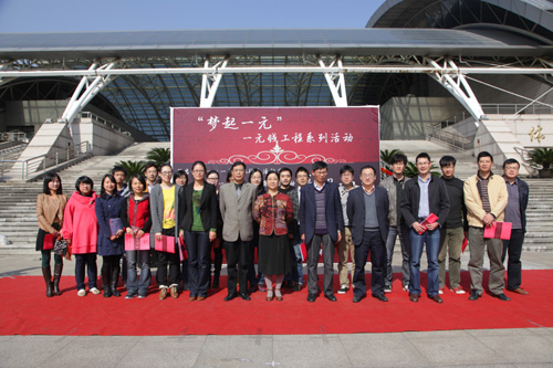 11月13日中午12点15分,由经济与国际贸易学院、外国语学院共同举办的“梦起一元——一元钱工程系列活动”在体育馆前开幕。校“一元钱工程”基金会理事长、校党委副书记王宇航,宣传部、学生处、校团委以及经贸学院、外语学院相关负责人出席了活动。