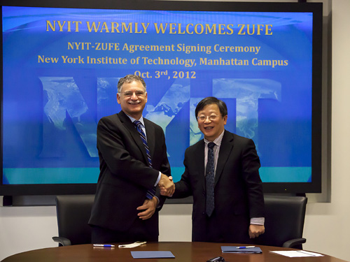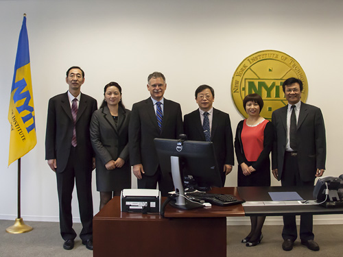 10月3日上午,我校代表团访问了纽约理工学院(NYIT)的曼哈顿校区,受到了校长爱德华·朱利亚诺博士(Edward Guiliano)的热情接待,同时出席会面的还有该校幕僚长彼得·金尼(Peter C. Kinney III)、校长特别助理维多利亚·法伊弗(Victoria Pfeiffer)和该校国际交流中心工作人员,双方就学生交流、教师互访、课程对接、学分互认等内容进行了广泛交流,达成了合作协议,举行了签约仪式。之后,代表团参观了纽约理工学院校园,重点考察了该校的金融实验室、远程教育中心、学生服务中心、学生就业指导中心等,先进的办学条件和良好的环境资源,给代表团留下了深刻印象。