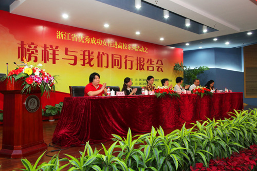 会上,省妇联副主席张丽萍作了致辞,教育厅副巡视员吴永良宣读了成立浙江省“优秀成功女性进高校”宣讲团决定,省妇联主席、省妇女研究会会长厉月姿为优秀成功女性代表颁发聘书。