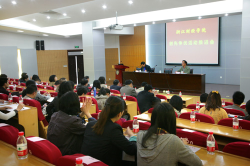 4月18日,我校在行政楼二楼报告厅举行了创先争优活动推进会。校党委书记韩翼祥、党委副书记朱永康出席会议,各党委职能部门主要负责人,各党总支(直属党支部)、东方学院党委负责人,党支部书记代表共100余人参加了会议。