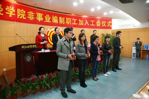 陈勇副主席在会上讲话。他首先向新会员的入会表示祝贺,并对学校党政给予工会工作的大力支持表示感谢,对校工会积极努力推动非事业编制人员入会工作以及取得的成效予以充分肯定。他说,浙江财经学院工会努力落实省教育工会的工作部署,认真务实地推动非事业编制人员入会工作,入会率已达到94%,在全省直属高校中名列前茅。希望在今后的工作中要更加关注非事业编制职工这一群体,做好校园和谐稳定工作,积极推进校园文化建设,营造和谐、快乐的校园文化,努力构建和谐的劳动人事关系。陈勇副主席对新会员提出四点期望,希望他们爱岗敬业、爱校如家、提高素养、共建共享,勉励新会员为学校建设出谋划策,多做贡献,在学校发展中实现自身成长。