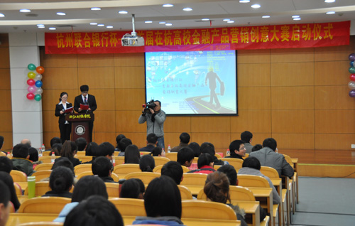 3月20日,“杭州联合银行杯”首届在杭高校金融产品营销创意大赛启动仪式在我校学术中心第二报告厅隆重举行。校党委副书记王宇航、杭州联合银行总行副行长江志达以及我校宣传部、学生处、团委等部门负责人出席了启动仪式。