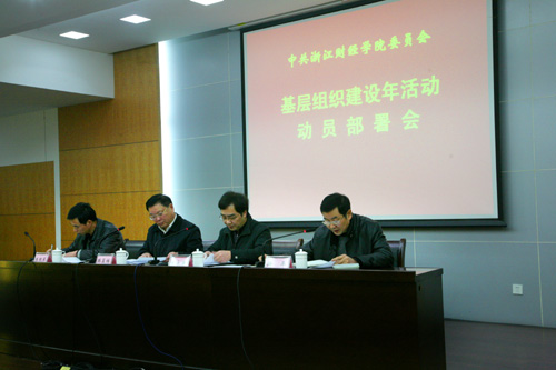 3月19日下午,我校在行政楼二楼报告厅召开基层组织建设年活动动员部署会。校党委书记韩翼祥作重要讲话,党委副书记朱永康主持会议,纪委书记朱根弟出席会议。各党总支(直属党支部)、东方学院党委负责人,党支部书记,有关部门负责人参加会议。