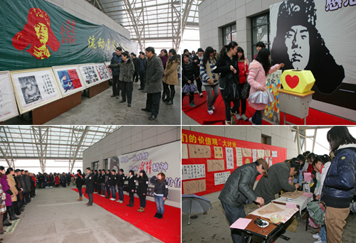 活动开始前,在体育馆平台举办的雷锋纪念馆流动展览受到了学校师生的热烈欢迎,许多老师和同学认真参观了展览。雷锋事迹珍贵照片和资料展示了雷锋同志生平和事迹,宣传了感恩、责任、奉献的价值观,号召大家传承并发扬雷锋精神。由校书画协会举办的以学雷锋为主题的书画小品展,也吸引了许多师生的参观,一些同学还用毛笔书写了体现主流价值观的书法作品。