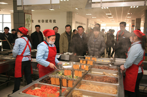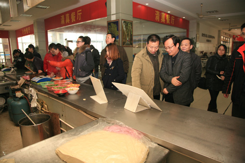 走访过程中,韩翼祥书记向食堂工作人员详细询问了学生考试期间食堂的卫生安全、饭菜质量、价格、保温等情况,并到清真餐厅与正在就餐的少数民族同学亲切交谈,认真听取了学生对目前饭菜价格、质量的意见和建议。最后,韩翼祥书记特别嘱咐后勤服务总公司要加强考试期间食堂服务工作,适当延长供餐时间,保证饭菜质量,确保让广大学生吃饱吃好,提升学生的满意率。黄建新副院长强调,学生食堂工作是后勤服务中的一项重要工作,要高度重视食品卫生安全,切实加强对食堂工作的监控工作,确保食堂饭菜质量、价格、数量不变,全力保障学生就餐需求。