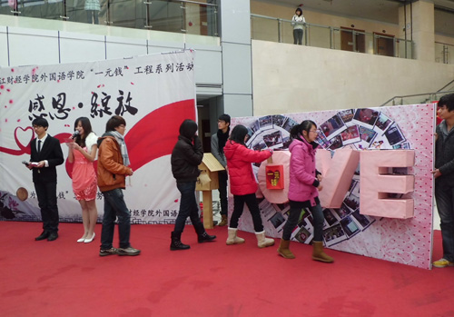 活动以英语单词“LOVE”为主线,以组成单词的四个字母为线索,将浙财人的感恩文化进行了全面的阐释。字母“O”如同一枚圆圆的硬币,代表着“感恩”校园文化的核心精神“一元钱”工程,号召财院学子能以力所能及之力捐助他人;字母“L”代表“LIVE”——生活,提醒同学们在学习型公寓建设过程中,珍惜同窗室友情,在学习中,牢记师恩情,在生活中不忘父母恩;字母“V”代表“VOLUNTEER”——志愿者,引导同学们在学习之余,尽己之力回报社会;字母“E”代表“EDUCATION”——教育,诣在告诉大家,“感恩”文化的教育不仅是教育本身,而是需要经过每位同学消化、吸收再加以传承的一份宝贵的精神财富。