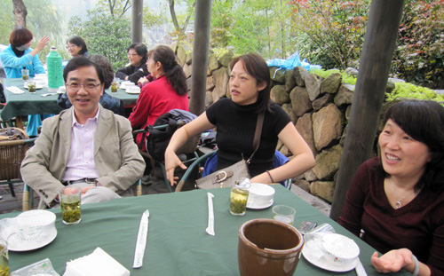 在朱永康副书记的带领下,女教授们兴致勃勃地拾级而上,来到慈云岭,并一路攀行,登临玉皇山顶。中午时分,大家来到了山脚下的八卦田农庄,女教授们一边喝茶吃饭、一边谈笑风生。