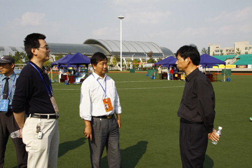 朱根弟书记首先对负责安保的工作人员表示亲切的慰问,同时也详细询问了开赛以来的工作情况,并强调大家一定要保持好工作状态,确保比赛顺利进行。由于19日开赛的残运会马拉松项目的起点位于我校南门,朱书记还听取了安保负责同志关于马拉松项目有关的准备工作的情况汇报。随后,朱书记现场观看了上海对重庆的比赛。相关人员向朱书记介绍了盲人足球比赛的赛规、各参赛队伍的基本情况以及几天来的比赛成绩。