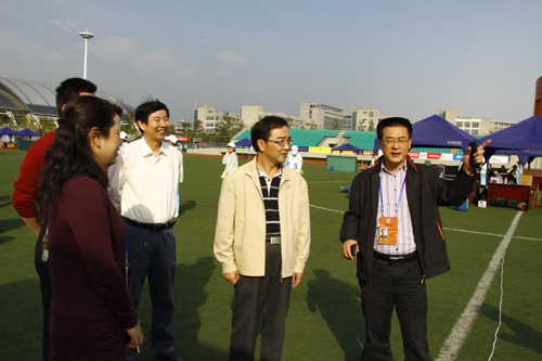 10月15日,党委副书记朱永康亲临八届残运会盲人足球比赛现场,亲切慰问了为本次赛会付出辛勤劳动的工作人员,详细询问了各工作处的运行情况,认真听取了盲人足球比赛的赛规和参赛队伍的基本情况介绍,并饶有兴趣地试踢了盲人足球比赛专用球。在相关工作处领导的陪同下,观看了浙江队对黑龙江队的整场比赛。赛后,朱永康副书记高度赞赏了残疾人运动员乐观向上、顽强拼搏、励志奋进的精神。