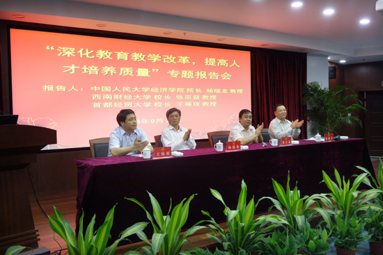 9月19日,我校举办了“深化教育教学改革,提高人才培养质量”的专题报告会。中国人民大学经济学院院长杨瑞龙教授、西南财经大学校长张宗益教授、首都经济贸易大学校长王稼琼教授做了专题报告。报告会由校党委书记韩翼祥主持。三位专家分享了他们在教育教学各个方面的研究和实践经验。