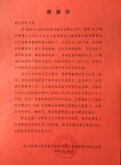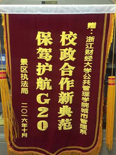 本网讯(通讯员 程晓东)公共管理学院以G20杭州峰会召开为契机,与杭州西湖风景名胜区城市管理行政执法局开展合作,选拔了24名2015级城市管理专业学生赴西湖景区见习实训。他们的青春身影和活泼形象极大改善了市民和游客对城管执法的社会认知,同时也增加了社会认可度。日前,景区执法局发来感谢函并赠以锦旗,对我校与该局共建G20保障辅助队伍、顺利完成G20服务保障工作给予了高度肯定和评价。