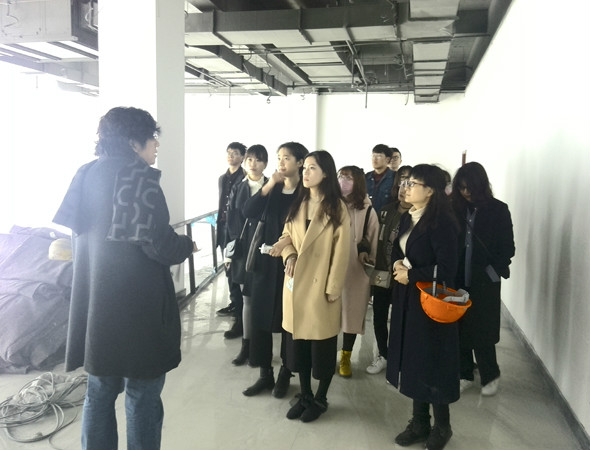 中铁四院集团公司的办公大楼整体施工业已完成,处于室内设计装修阶段,在工地现场,艺术学院合作单位龙邦设计院院长段晓东亲自带领学生参观整个楼层,每到一处都细心给学生讲解房间内的空间结构、装修设计、采暖、通风、温湿调节、自然光、人工照明、家具、饰物的布置等方面的设计与处理。