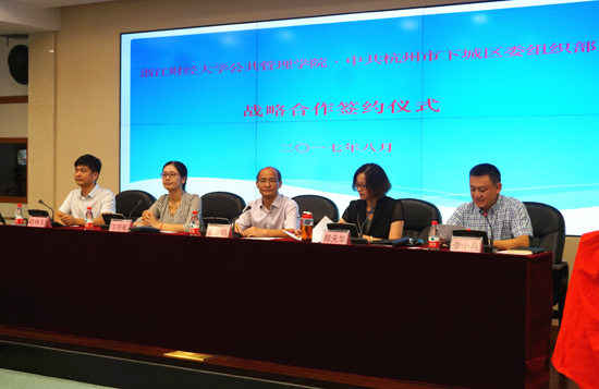 本网讯(通讯员 韦晓蓓)8月15日,公共管理学院与下城区委组织部战略合作协议签订仪式在下城区行政中心举行。下城区委组织部副部长、区委人才办主任郑天华,区委人才办副主任李小兵,公共管理学院院长郭剑鸣、院党委书记沈晓敏、院党委副书记程晓东等出席仪式。
