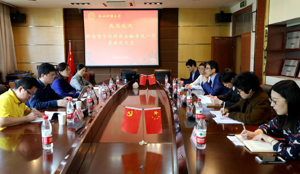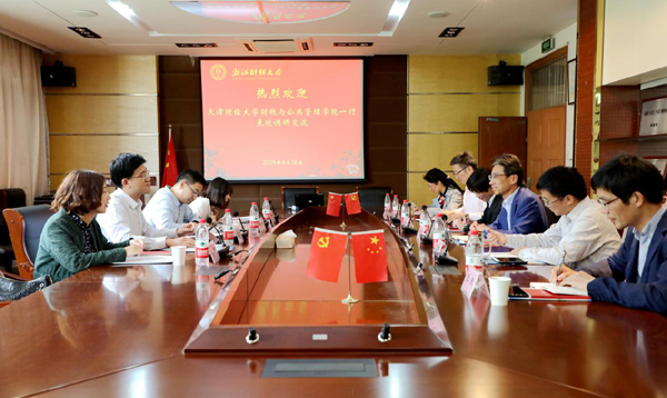 本网讯4月18日,天津财经大学财税与公共管理学院院长陈旭东、湖南商学院财政金融学院副院长温桂荣分别带队来我校财政税务学院调研交流。财政税务学院院长李永友等热情接待了来访客人。