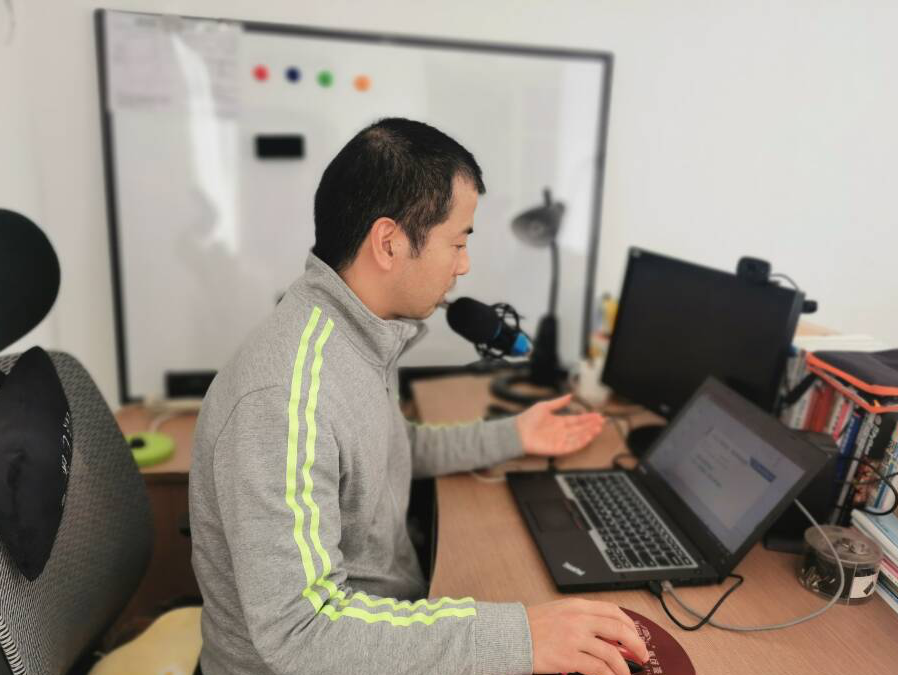 网络教学打破传统教学模式,将学习场景从线下延伸到线上,对于老师和学生都是一场考验。陈明晶老师为了保证课堂教学效果,除了在开课前积极参与线上网络教学培训,认真学习网络教学方法之外,他还多次组织课程团队成员开展线上直播教学研讨,重新设计课程教学环节,优化教学流程,将教学内容进行了详细的分解定位,使课程更加契合网络教学的新形式。陈明晶老师在直播设备的准备上也做足了功课。他将书房改造成了“直播间“,增加了话筒、声卡、白板、照明设施等设备以提升直播效果,确保达到最好的网络教学效果。