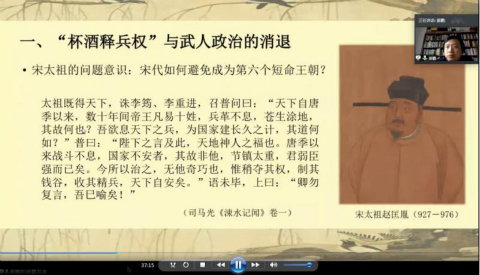 宋代是中国历史文化发展的鼎盛时期,姜鹏副教授首先从最近热播大剧《清平乐》讲起,随后围绕《资治通鉴》和宋代文化展开,详细解读了宋代文化繁荣背后的原因。姜鹏副教授通俗易懂的表述,再加上自身独到的见解和有趣的历史故事,提高了广大师生对《资治通鉴》和宋代文化的兴趣。虽然特殊时期特殊的讲座形式,师生无法面对面交流,但透过屏幕,依然可以感受到同学们的热情。