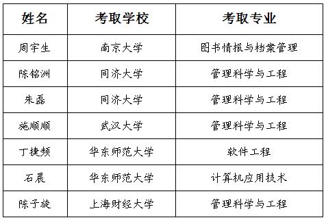 本网讯近日,全国各高校陆续公布了2020年博士研究生招生录取名单,信智学院2020届硕士研究生周宇生等7名同学被南京大学、武汉大学、同济大学、上海财经大学等校录取,考博率达70%。