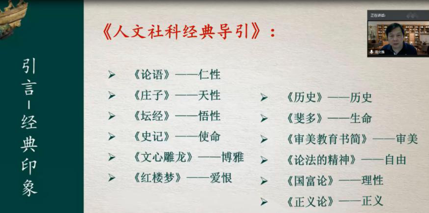 本网讯9月29日,通识云讲堂第四期开讲。武汉大学文学院教授、博士生导师高文强走进云讲堂,分享了主题为《发现:看不见的经典》的讲座。虽然隔着腾讯会议和钉钉直播的屏幕和教授互动沟通,但同学们对于通识文化的热情并没有削弱。