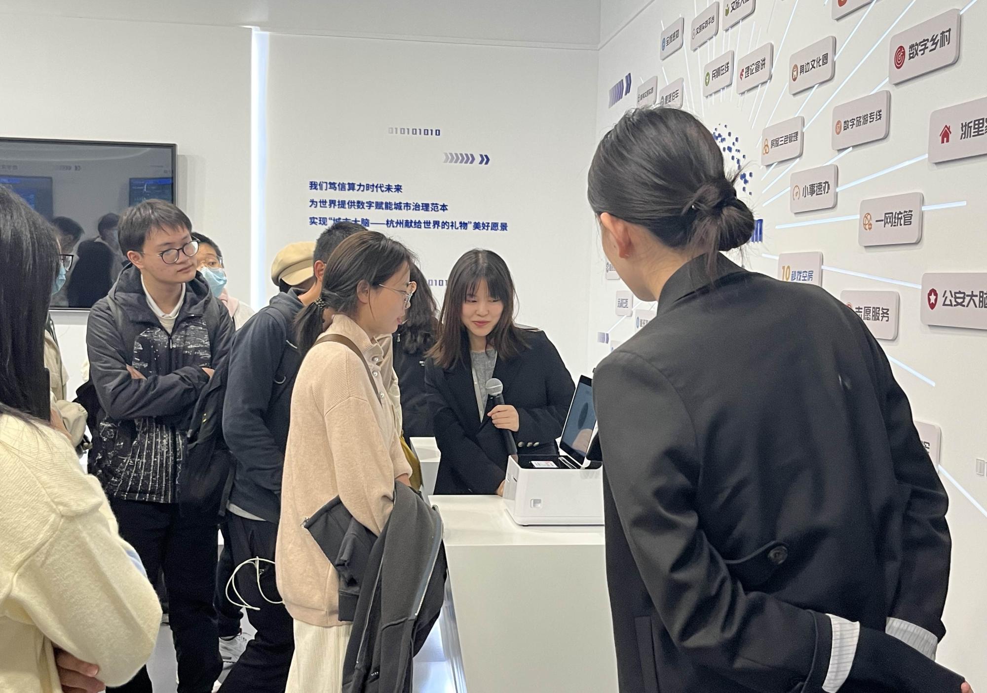 师生们来到杭州城市大脑数字城市技术展厅开展现场研学探讨。展厅基于数字城市集约化建设平台CPaaS,以多维度、多样化、多形式呈现在科技土壤中不断生长的城市治理现代化成果,通过公众能理解、易接受的方式进行展示,增加参观的趣味性、互动性和体验性。