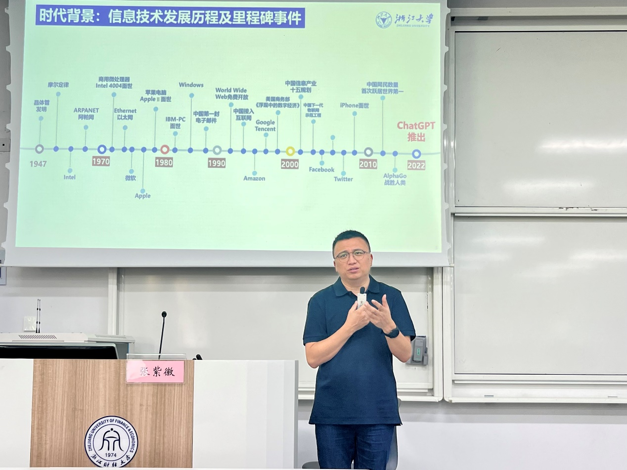 讲座邀请浙江大学信息技术中心总工程师张紫徽作《人工智能赋能教师数字素养提升》专题报告。张紫徽介绍了信息技术的发展历程以及影响高等教育未来发展的新兴、关键技术与实践趋势。结合浙江大学在数字化改革方面的经验,他生动阐述了浙江大学“云、网、数、端”的数字新基建体系,并结合多个具体案例,详细介绍了浙江大学“数智驱动”教学创新体系理念的形成与实践历程。他强调,作为新时代的教师,必须不断提升自身的数字素养,掌握必要的信息技术知识和技能,才能更好地适应未来教育的发展需求。要充分利用AIGC技术的强大能力,不断革新传统教研方法。同时,张总工对AI大模型+教育提出了展望与构想,以期将一张蓝图绘到底。