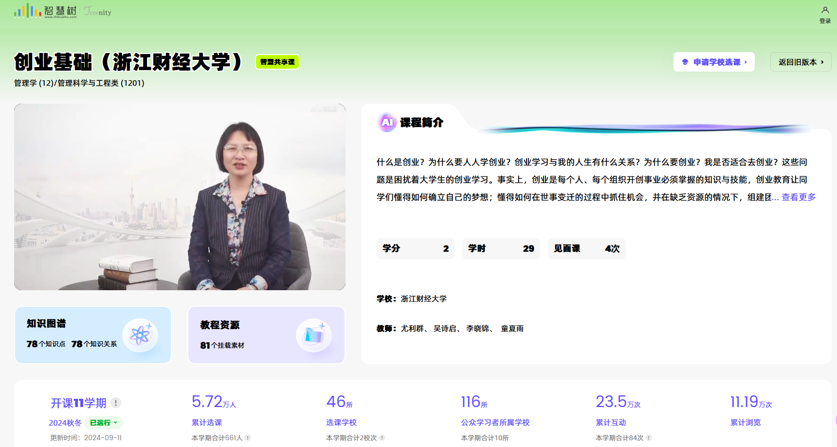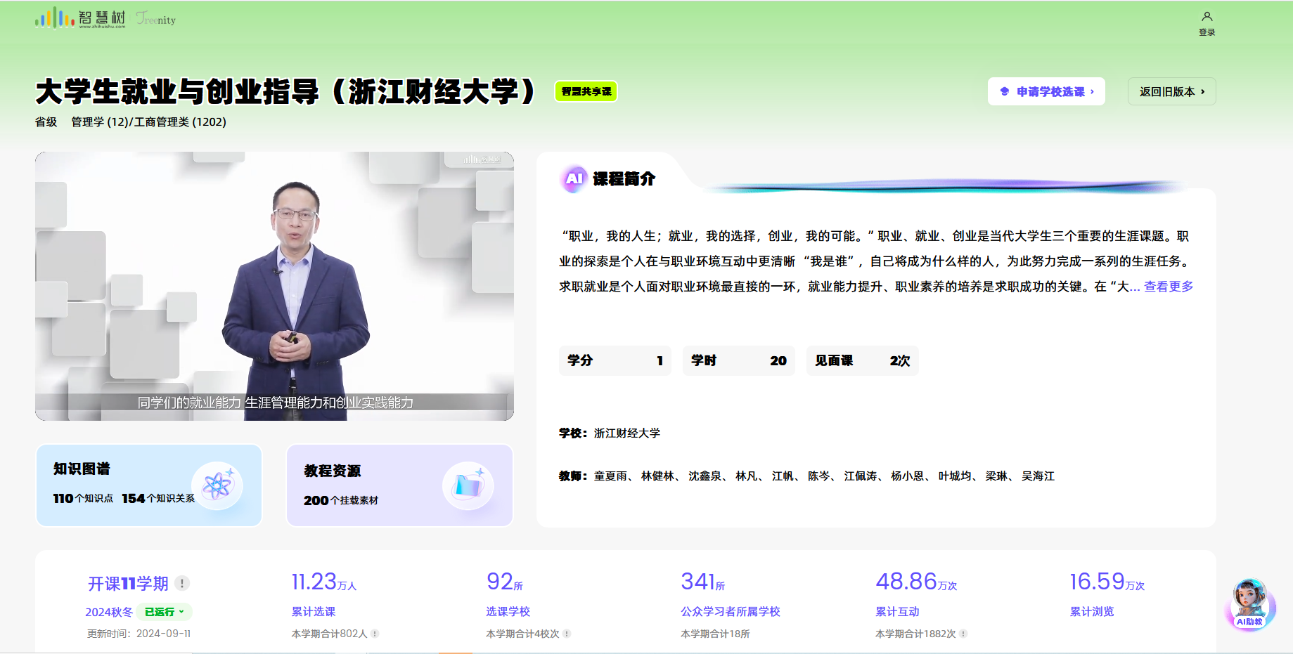 本网讯近日,智慧树2024年秋学期首批1003门知识图谱AI智慧课程全国共享运行,其中浙江省共208门智慧课程,学校创业学院开设的《创业基础》《大学生就业与创业指导》2门课程成功入选。