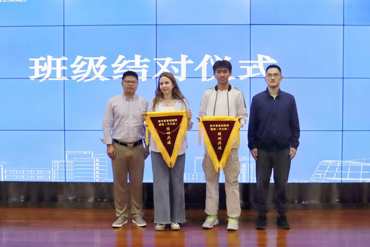 经济学院、国际学院相关负责人为结对班级代表授予合作共建旗帜。