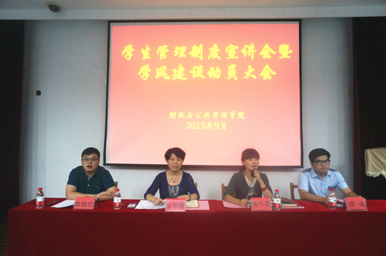 9月29日中午,财政与公共管理学院举行学生管理制度宣讲会暨学风动员大会。学院领导吴利群、杨小恩出席会议,全体辅导员和各年级学生干部代表200余人参加了大会。