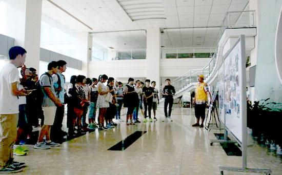 整个参观过程中,图书馆还推出了两块引人注目的展板:一块展示的是各个角度下的图书馆以及毕业生在图书馆的合影留念;另一块展示的则是今年毕业季图书馆书单活动中,借阅量较高的毕业生书单合影留念。每当引导员向大家介绍位于展板中间的去年毕业生借书量最大的姚文欣学姐时,新生们都不由地发出赞叹。引导员热情专业而又诙谐幽默,新生也是听得津津有味,时而驻足,时而凝视,时而打探,对这个未来四年的重要学习场所充满期待。