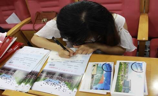 今年,金融学院第一批共录取322名新生,在寄给新生的信函中,除录取通知书外,还特意为每位新生精心制作了一张个性化的明信片。明信片的正面是手绘版的校园风光,背面是学院采用原创的“凡客体”,对即将到来的新生表达了祝贺,并提出了学涯规划的建议。图书馆,学涯湖,橘黄油桶,这些财大独有的标志性建筑无一不体现学校浓浓的生机与活力。“爱生活,爱理财,爱投资,更爱涨停”、“你是下一个金融界的大咖!”……通过诙谐幽默的“凡客体”,表达了对新生美好未来的憧憬。每张明信片上的新生姓名,都是由金融学院学生一横一竖,一撇一捺写上去的,相信这封特别的录取通知书会让每位新生感到温暖和欣喜,也为自己是学院一员而感到骄傲与自豪。