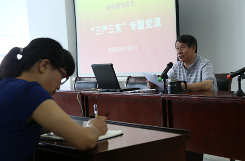6月24日,图书馆党总支书记张守凯同志讲授“三严三实”专题党课,紧扣“三严三实”主题,联系图书馆实际,联系党员干部思想、工作、生活和作风实际,深入解读了“三严三实”的内涵和意义,并从践行“三严三实”的角度出发,分析了目前图书馆工作中存在的一些问题,针对如何整改这些问题谈了自己的看法。图书馆党总支全体党员及各部主任认真聆听了此次专题党课。