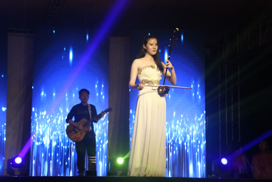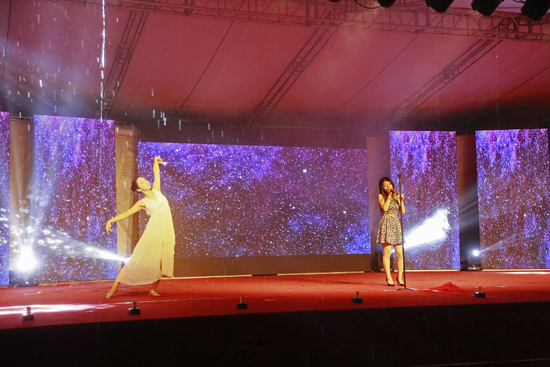 表彰结束后,毕业生晚会正式拉开帷幕。此次晚会以“乘上868,梦想出发”为主题,以内容饱满,形式丰富的独唱、小组唱、越剧、舞蹈、器乐合奏、朗诵等节目呈现出“梦想扎根钱塘”、“梦想汇聚东方”、“梦想扬帆起航”三个精彩篇章,为学院广大师生带来了一场视听盛宴。演出以财税分院别具一格的佤族舞蹈《燃烧吧,青春》开篇,用火热的激情阐述着青春的昂扬;师生联唱节目中,外国语分院党总支书记聂素民的一曲《红梅花儿开》、财税分院院长樊小钢的一曲《鸿雁》与2015届“十佳歌手”的联袂演出引得现场欢呼一片;一曲低缓的器乐伴舞《匆匆那年》感叹时光如梭,泛着毕业季的点点忧伤;身着民国装的2015届毕业生辅导员精彩亮相,一曲《同桌的你》饱含对毕业生们的不舍与祝福;大学生艺术团动感的舞蹈串烧《怒放东方梦》将现场气氛掀起阵阵高潮;宿管阿姨俪霞、沈慧芬演唱的越剧《十八相送》承载着与学生朝夕相处的校园服务岗的教职员工的真切情感。人气歌手一曲《时间煮雨》的倾情献唱,搅动了全场的情绪;学生创作的诗歌《当四年只剩下四天》带着离别的不舍,对母校的感恩,道出了毕业生的心声;现代舞《时间都去哪儿了》,在旋律的起承转合中展现了2015届毕业生四年精彩的成长历程。