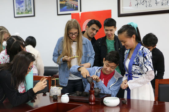 伴随着悠扬的背景音乐,司仪开始向留学生展示茶道。他们用茶盘、闻香杯、六君子,高冲低斟、公道分茶、鱼跃龙门等独特的器具,再加上行云流行般的动作,沏出香醇的茶汤。留学生无不感受到了中国茶道的神奇魅力。