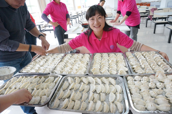 外国语学院的李斌荣老师说:“要做一个上得了厅堂,下得了厨房的女子。”除了要能在上课时波澜不惊,娓娓道来,还要在厨房食堂大显身手。果然,她包得又好又快,赢得了众人的一致好评。最后,李老师和满满的两大盘饺子合了一张影,又热情地去帮助别的老师了。