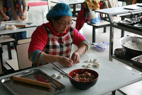 法学院赵琼老师正专心致志地包着一盘饺子,远处一位男老师跑来求教。原来赵老师包的饺子不是“浙里”的南方饺子,而是传承于北方的特色饺子。饺子的包法看上去并不难,它是从一边捏起,一提一按,就顺着脉络到了另外一边。可是实际操作起来却不容易,年轻的老师、同学们现学现试,依样画葫芦,却做得不尽如人意。赵老师说:“以前,我们七八岁时就在大人边上帮着做饺子,可现在很多人只会吃速冻饺子了。”