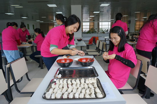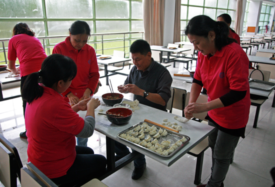 这里,几个老师凑在一起,一个揉面团,一个擀面皮儿,一个包饺子,分工合作,忙得不亦乐乎。那里,一位老师包揽全局,从容不迫技术娴熟的捏着饺子,各流程了然于胸,引来不少食堂工作人员的驻足观望和赞不绝于口。