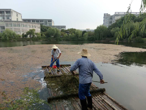 学校大范围的维修改造,给负责垃圾清运、道路清扫的物业人员增加了工作任务。学涯湖水草茂盛,工人们顶着烈日清理水草,保持湖水清洁。3500多名新生的床上用品需求情况统计工作已经完成,将陆续按需配备放入学生寝室。