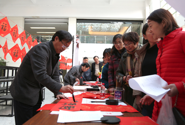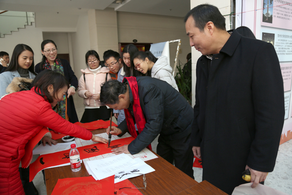 活动现场洋溢着新年的喜庆气氛,荡漾着淡雅的墨香。校领导李金昌、黄建新首先开笔书写大红“福”字赠送师生。校教工书协、艺术学院书法专业、学生书画社团、离退休阆苑书法社的师生近20人,现场挥毫泼墨,撰写春联1000余副,送出1000余个“福”字。