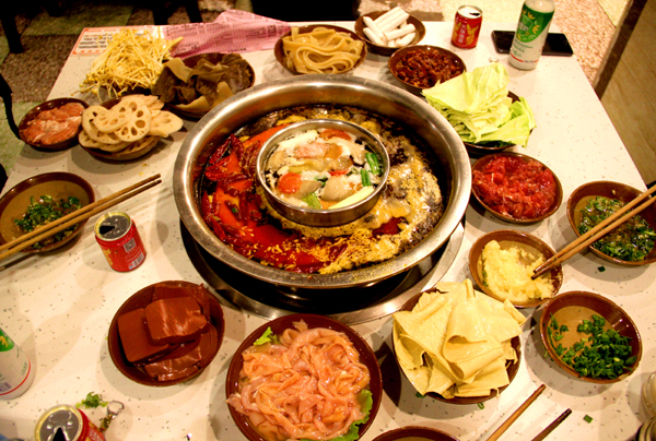 一提川渝,仿佛就闻到了满城的麻辣香味。山城火锅,可谓名噪大江南北,已然成了重庆的一张城市名片。起兴明清,以麻辣为主要特征,红汤铜锅,凝合着重庆人的生活日常与文化传统。在山城,愈是美味的店,往往店面不大起眼。奔着有名的坎下老灶火锅去,近解放碑,山城行道上下交错弯弯绕绕,总算觅对了地方。扑面是划拳吆酒声中,浸肤的麻辣香。