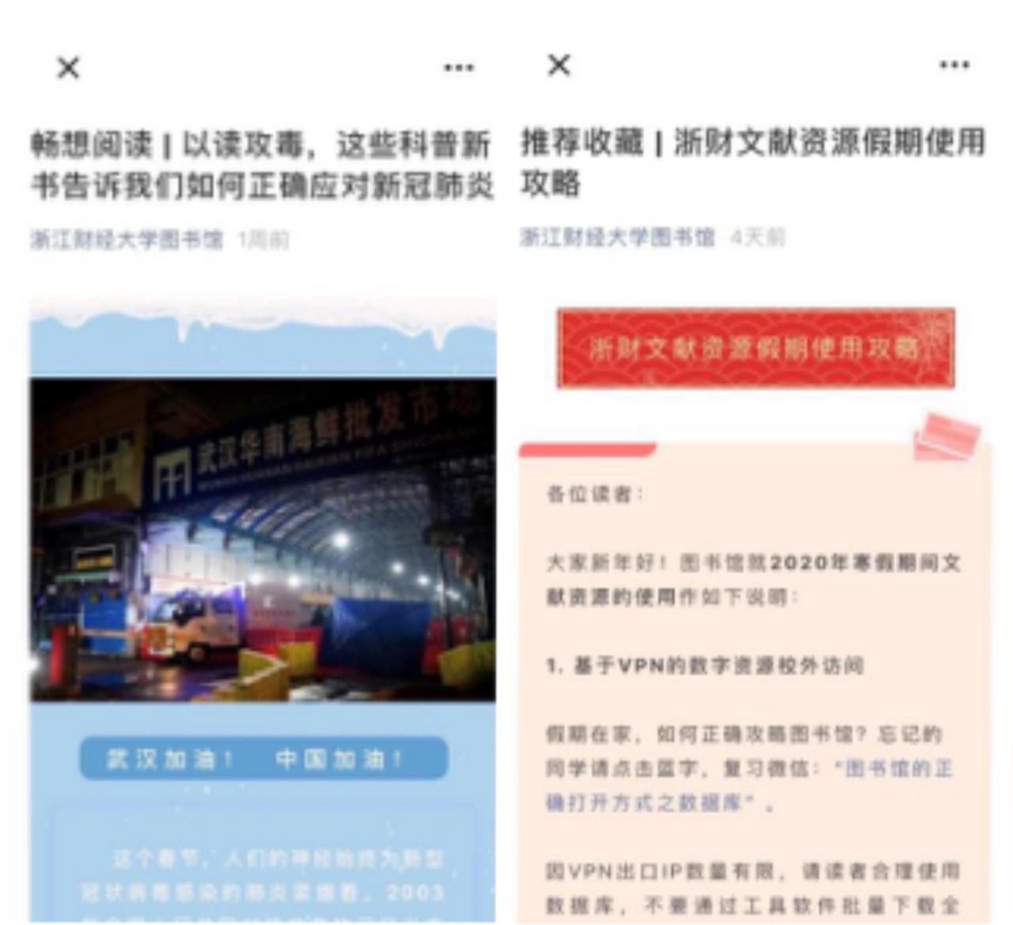 闭馆期间,图书馆关注广大师生读者学习和科研需求,及时调整服务方式,各部门通力合作,图情服务24小时不打烊。畅通资源获取渠道。网上电子资源服务全天开放,在线实时解答各类资源使用问题,保障师生正常获取数字资源。推出《浙财数字资源假期使用攻略》、《疫情期间免费开放的数据库资源汇总(一)(二)》等指南,便捷师生,助力教学科研工作。