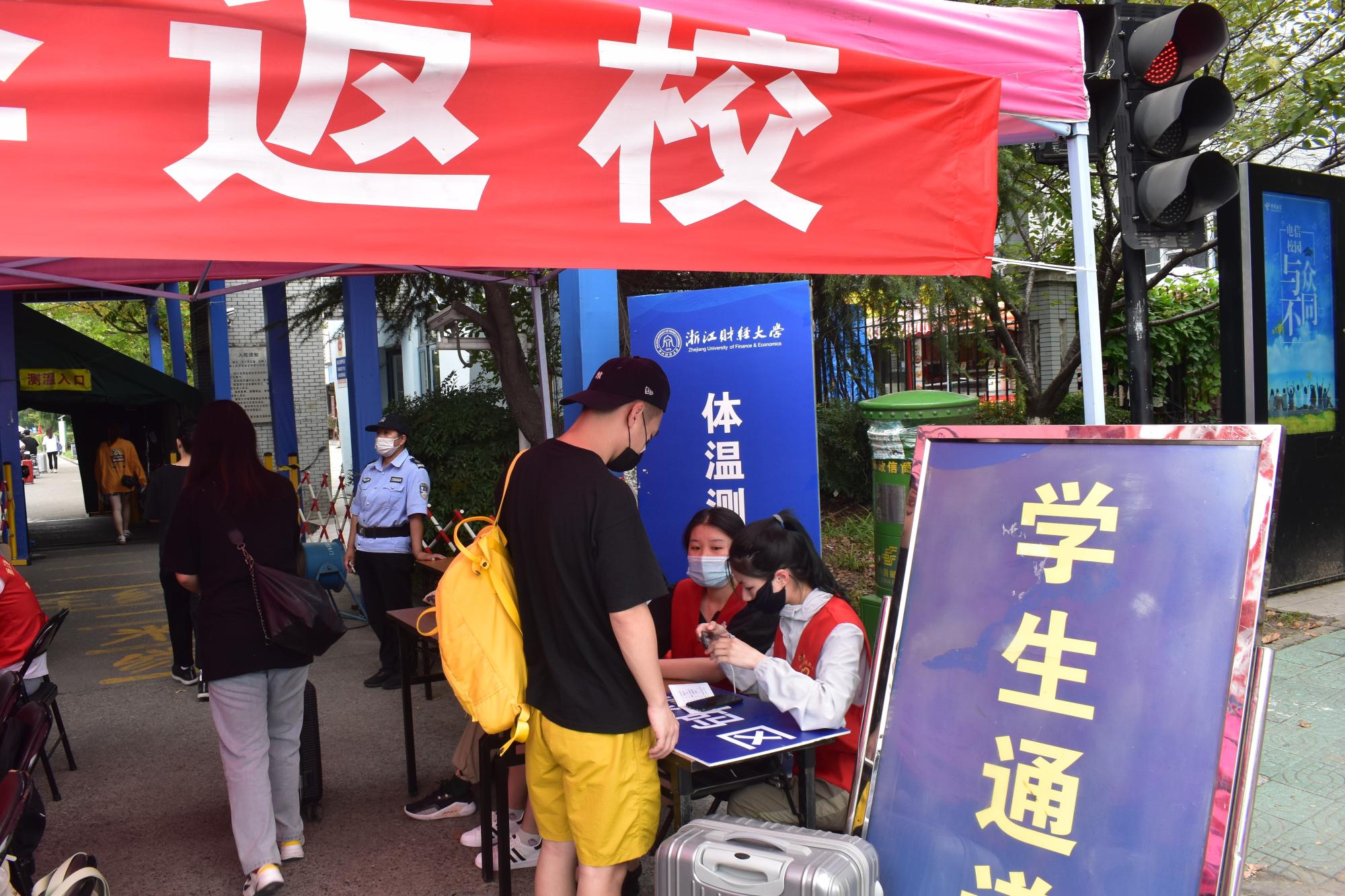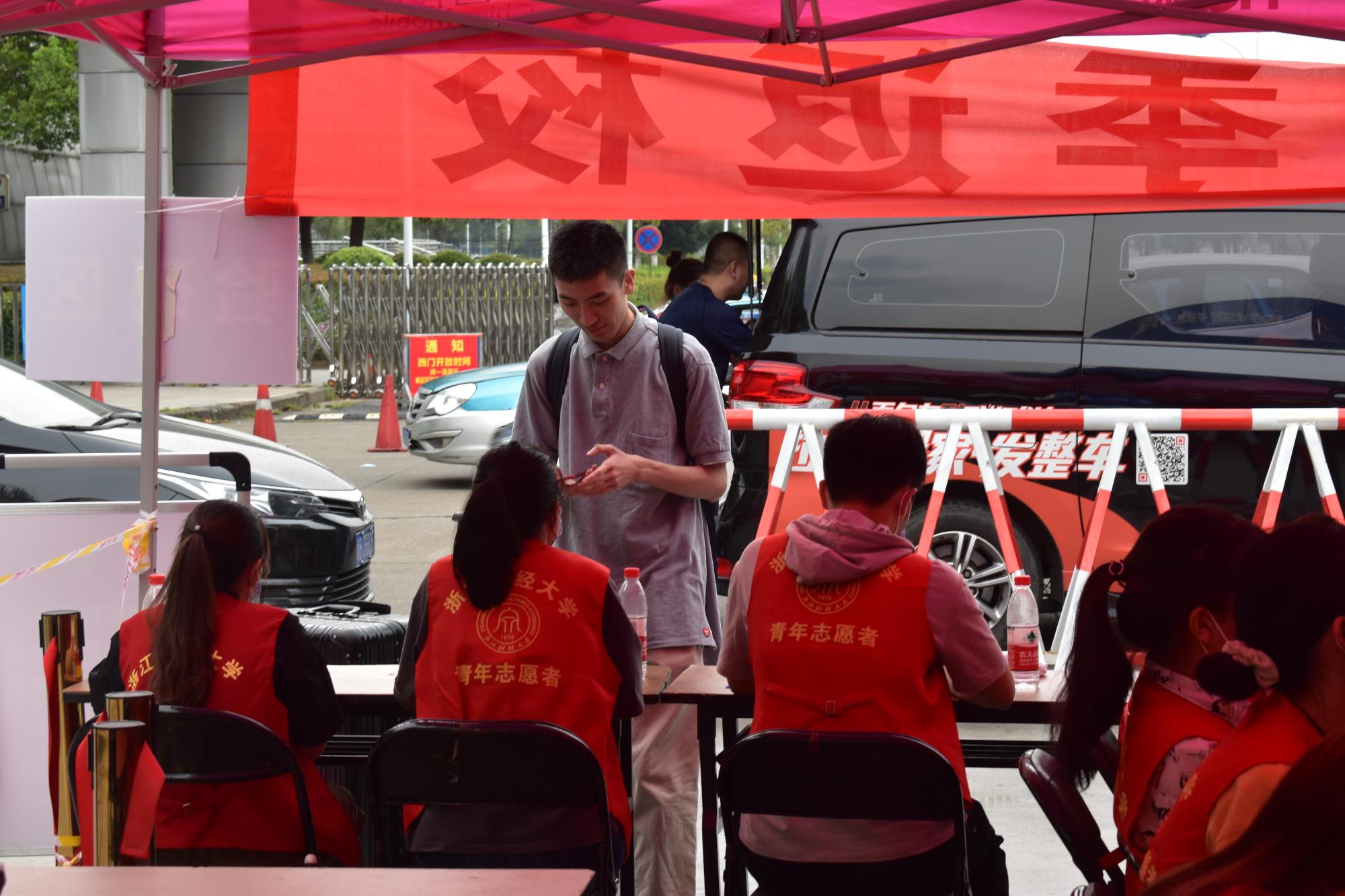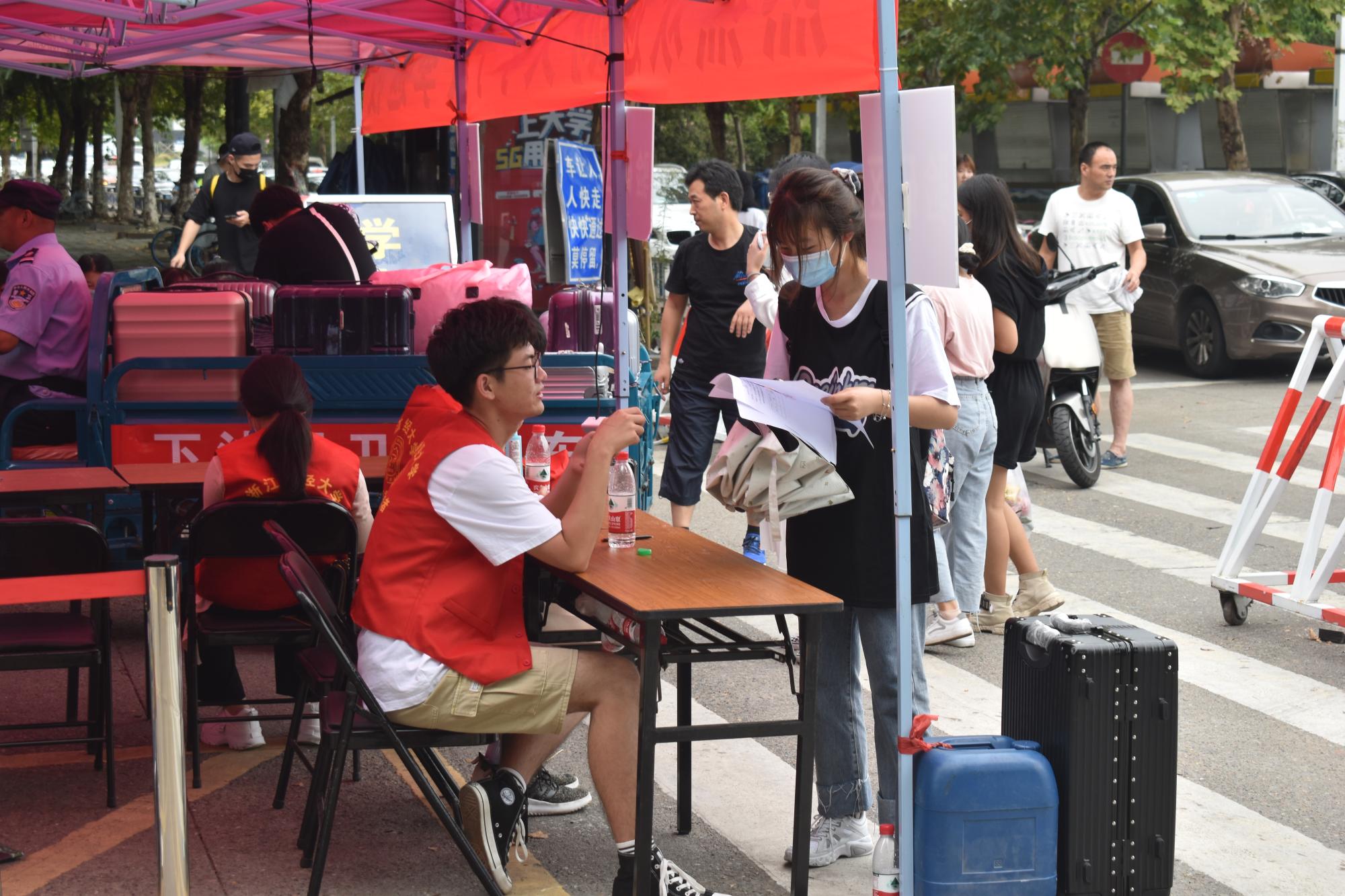 根据疫情防控常态化工作需要,返校学生需严格进行扫码、测温、登记等程序方能进校,学校分别在地铁口、南门和公交车站等地设置了学生服务点,安排青年志愿者负责检查研究生新生录取通知书、查看报到通行码、测量体温等事宜,同时协助新生把行李送至临时存放处。