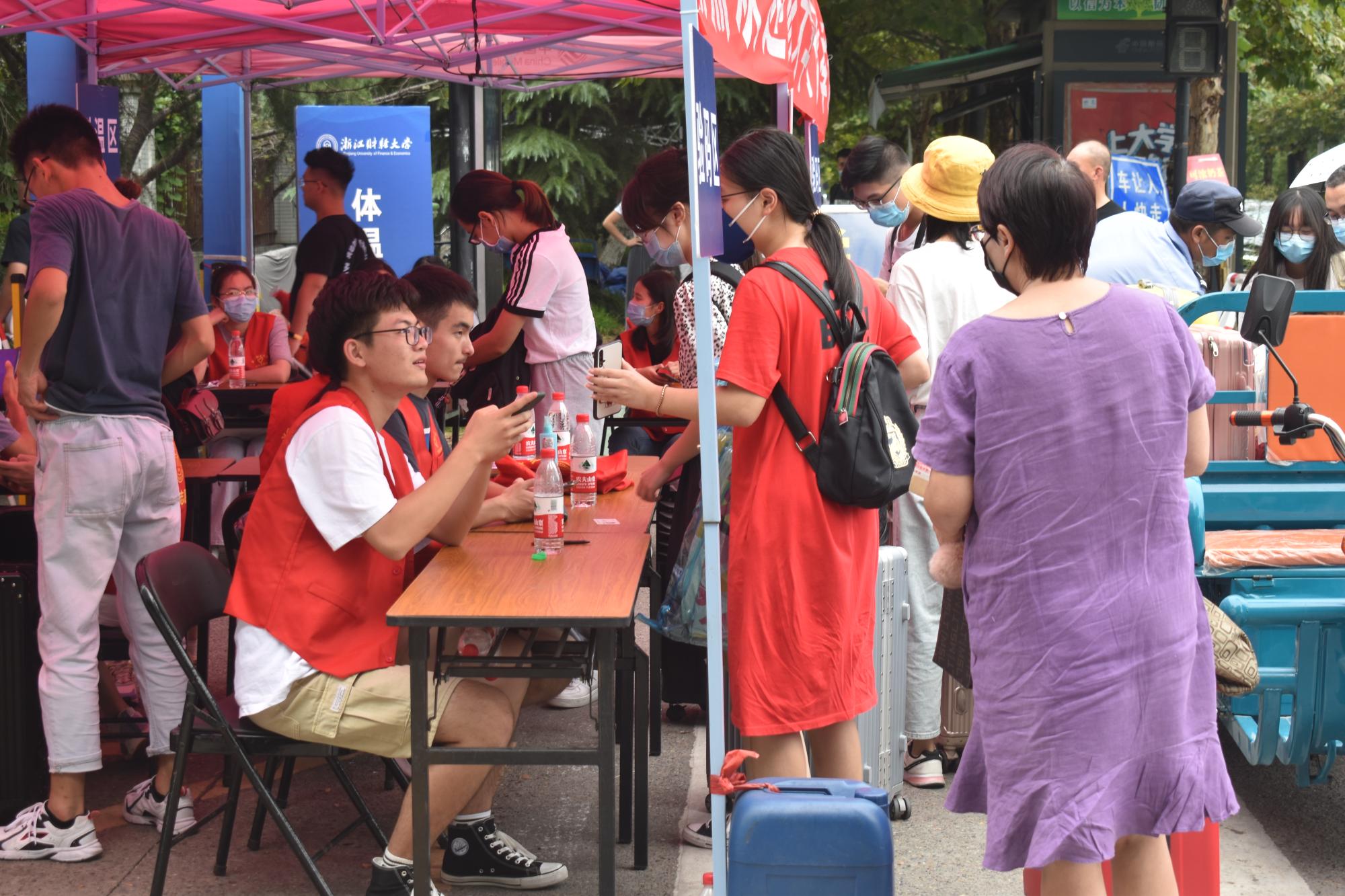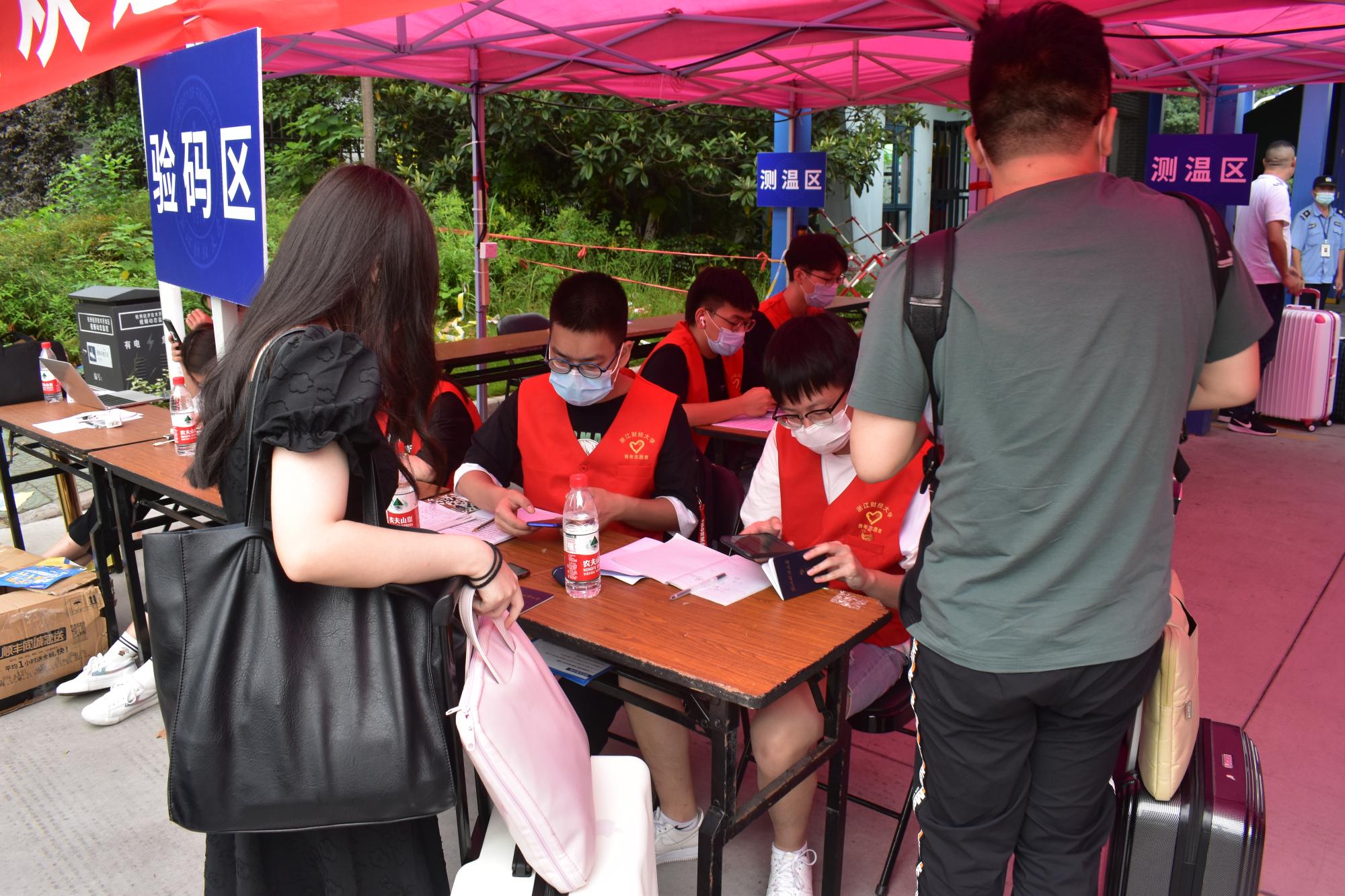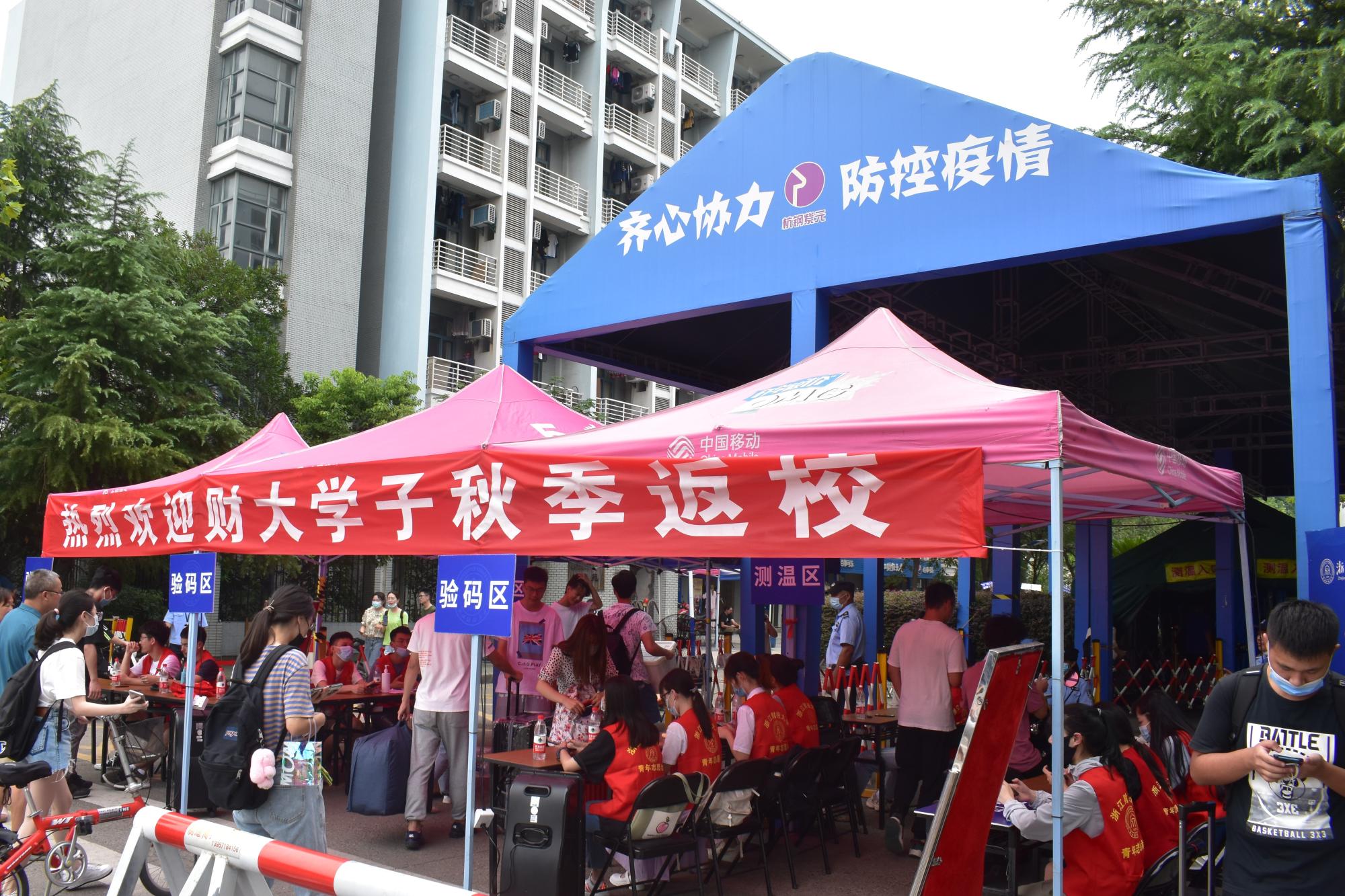 根据疫情防控常态化工作需要,返校学生需严格进行扫码、测温、登记等程序方能进校,学校分别在地铁口、南门和公交车站等地设置了学生服务点,安排青年志愿者负责检查研究生新生录取通知书、查看报到通行码、测量体温等事宜,同时协助新生把行李送至临时存放处。
