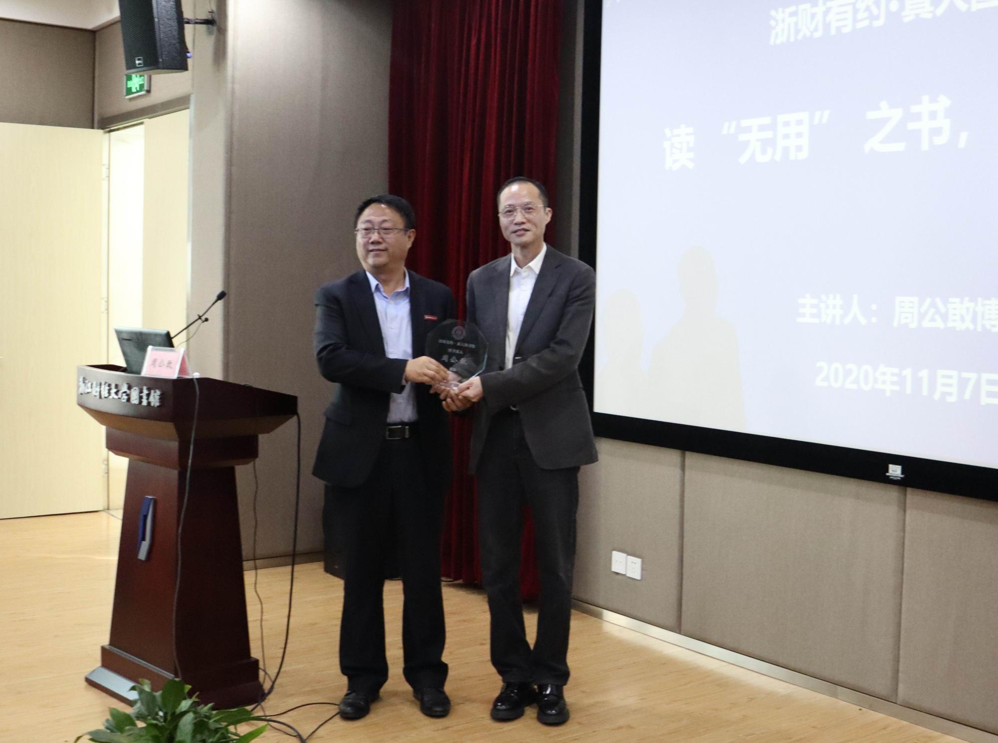 活动开始前,副校长李占荣为周公敢博士颁发“图书真人纪念牌”。