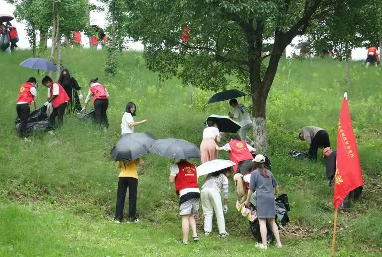 全体新党员穿上红鹄党员志愿服务队的红马甲前往校园北山坡开展新党员劳动实践教育活动。作为入党第一课,青年党员同志冒着绵绵细雨,清理后山杂草、枯枝、白色垃圾。山坡上飘扬的鲜红党旗在雨水绿树的映衬下显得格外鲜艳。红鹄学子学党史、办实事,用劳动践行革命精神,真正将全心全意为人民服务落在实处。