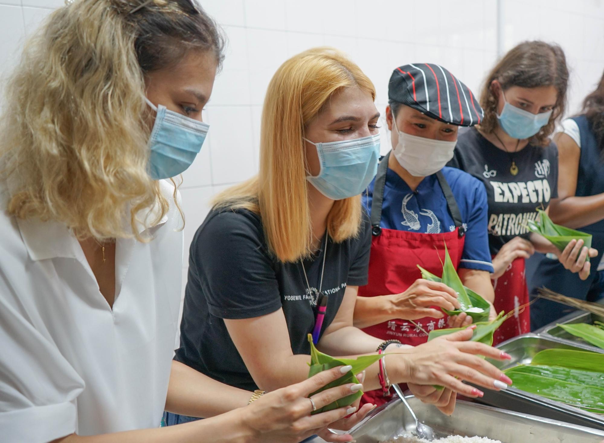 在后勤师傅们的指导下,留学生们认真地折粽叶、填粽米、放馅料、系粽绳……看似简单的几个动作,学到最后不是包成扁的,就是四角漏米。经过多次摸索,片片粽叶在不同肤色的同学手中被折成了各式形状。看着自己亲手包好的长短不一、形态各异的粽子,大家都笑作一团,一边为有趣的文化体验兴奋不已,一边感受到了浓厚的节日氛围。